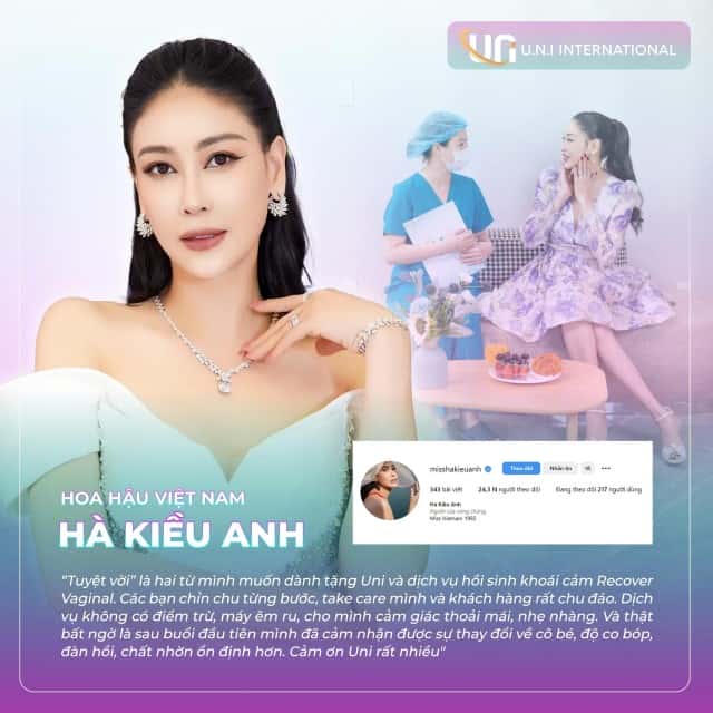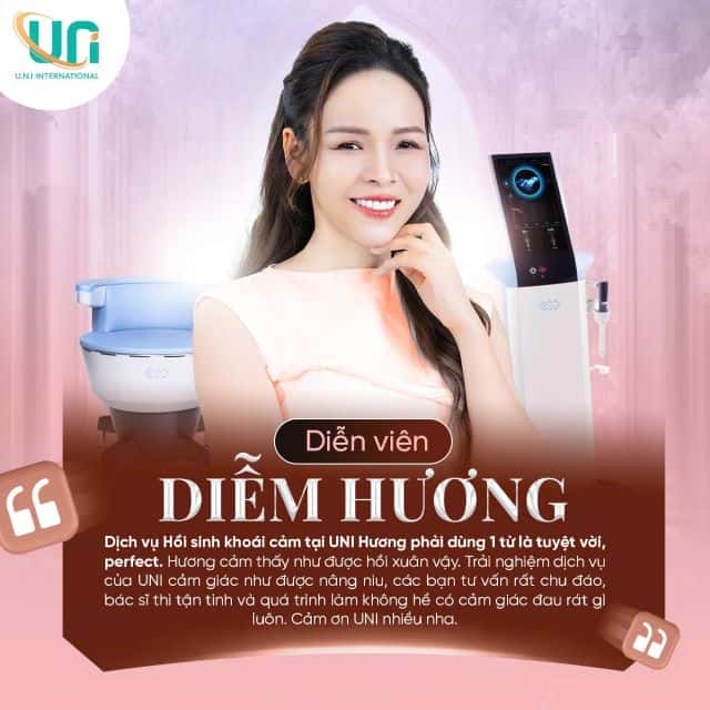 Đặc biệt, dịch vụ hồi sinh khoái cảm của UNI đã trở thành biểu tượng vượt trội, đem lại trải nghiệm đẳng cấp cho phái đẹp. Với phương châm “Làm đẹp chuẩn y khoa”, thương hiệu đã chinh phục được sự tin tưởng của đông đảo khách hàng, đặc biệt là những người nổi tiếng, từ diễn viên đến hoa hậu và các ngôi sao hàng đầu như Hoa hậu Hà Kiều Anh, Diễn viên Nguyệt Ánh và Diễn viên Diễm Hương.